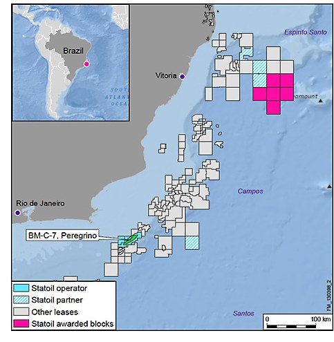 "These new licences in the Espirito Santo basin give us a significant acreage position in a proven hydrocarbon basin. They have the potential to provide large-scale additional resources close to our existing discoveries, which with success will result in Statoil building a new core position," says Dodson. Statoil operates the Peregrino field in Brazil, which came on stream in April 2011, and Statoil is currently the largest international operator in the country. Statoil is also operator of some of the world's largest oil and gas discoveries over the last couple of years and has a strong safety and environmental record. The 11th bidding round on 14 May was conducted by the ANP. The concession agreements from the 11th licencing round are scheduled to be signed in August 2013. In the 11th licencing round in Brazil Statoil has been awarded: • Six exploration licenses in the Espirito Santo basin, of which four as operator and two as partner. • The licences are located in the deepwater sector of the Espirito Santo basin, close to the licences BM-ES-32 and BM-ES-22A which are operated by Petrobras and in which Statoil is already a partner. • The blocks have an exploration phase of seven years, divided in to two periods of five years and two years, and the total well commitment for the six licenses is 10 wells. Consortium: ES-M-596: Petróleo Brasileiro S.A.* (50%), Statoil Brasil Óleo e Gás Ltda. (50%) ES-M-598: Statoil Brasil Óleo e Gás Ltda.* (40%), Petróleo Brasileiro S.A. (40%), Queiroz Galvão Exploração e Produção S.A. (20%) ES-M-669: Petróleo Brasileiro S.A.* (40%), Total E&P do Brasil Ltda. (25%), Statoil Brasil Óleo e Gás Ltda. (35%) ES-M-671: Statoil Brasil Óleo e Gás Ltda.* (35%), Petróleo Brasileiro S.A. (40%), Total E&P do Brasil Ltda. (25%) ES-M-673: Statoil Brasil Óleo e Gás Ltda.* (40%), Queiroz Galvão Exploração e Produção S.A. (20%), Petróleo Brasileiro S.A. (40%) ES-M-743: Statoil Brasil Óleo e Gás Ltda.* (35%), Petróleo Brasileiro S.A. (40%), Total E&P do Brasil Ltda. (25%) Statoil press release |