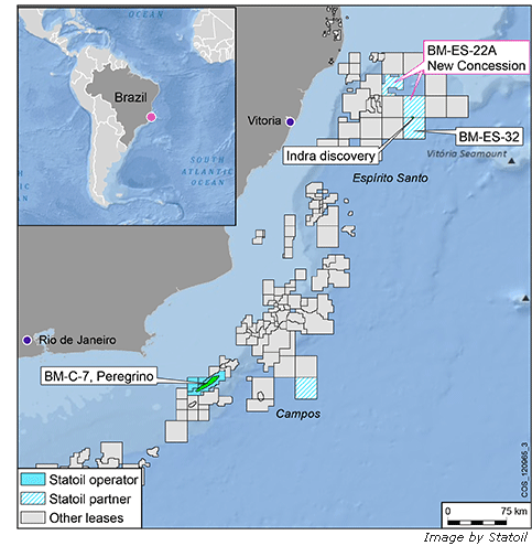 The Indra discovery was made in BM-ES-32 where Petrobras is the operator with 60 % interest. Statoil holds the remaining 40 % interest. The exploration well was completed in December 2010 at a water depth of 2,130 metres. The well found 70 meters of light oil in a good quality sandstone reservoir.