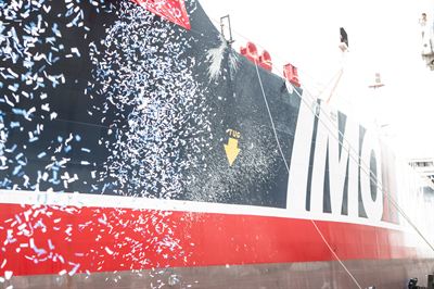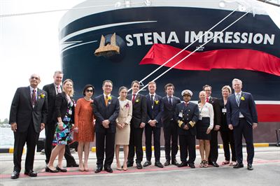 2/4/2015 The IMOIIMAX Stena Impression, a 50,000 DWT MR chemical tanker, was named in Singapore today. The Stena Impression is owned by a joint venture of which Stena Bulk and Indonesian Golden Agri Resources (GAR) each own 50 percent. The Stena Impression is the first of ten vessels ordered by Stena Bulk for a total of USD 400 million with delivery to be completed by 2017. The vessels will be operated by Stena Weco and will trade within the company’s logistical systems, which now will include fleet of some 60 tankers. The IMOIIMAX tankers have been designed to transport both vegetable oils, chemicals as well as clean and dirty petroleum products. A large number of international guests attended the naming ceremony in Singapore. The Stena Impression’s godmother was Jesslyne Widjaja, Director Corporate Strategy & Business Development, GAR. Her captain is Jacob Valiaveed. Tomorrow, the Stena Impression will begin her maiden voyage with a cargo of palm oil and is expected to reach her destination in the US in about two months. “The IMOIIMAX tankers will be a significant addition to our successful collaboration with Golden Agri. At the same time, it is a further step in the development of our existing sophisticated trading system”, says Erik Hånell, CEO of Stena Bulk, in a comment. The concept has been developed by Stena Teknik together with the Chinese shipyard Guangzhou. The tanker has 18 tanks of the same size, each with a capacity of 3,000 m3, which allows for greater cargo flexibility. A large number of innovative technical solutions have been implemented, which together, when sailing at service speed, result in 10-20% lower fuel consumption compared with other vessels of the same size. “Flexibility and energy savings are key characteristics of the IMOIIMAX concept. The configuration of several small tanks provides for considerable flexibility in regards of cargo combination, something that fits very well within our existing global logistical systems. The fact that the concept, with its many innovative technical solutions, will result in energy savings is naturally a major advantage”, says Erik Hånell, CEO of Stena Bulk. The remaining nine IMOIIMAX tankers are the Stena Image (owner: Concordia Maritime), the Stena Imperial (Stena Bulk and GAR), the Stena Important (Concordia Maritime), the Stena Imperative (Stena Bulk), the Stenaweco Impulse (Golden Stena Weco), the Stena Imagination (Stena Bulk and GAR), the Stena Immortal (Stena Bulk and GAR), the Stena Immaculate (Stena Bulk and GAR) and the Stena Impeccable (Stena Bulk and GAR). Some of the technical solutions that will result in more energy efficient consumption and greater logistic flexibility: • Main engine auto-tuning • More efficient boiler with recovery from multiple heat sources • Recovery of propeller energy loss • Aerodynamic design of the accommodation and bridge • All cargo tanks designed to carry any type of cargo the vessel can transport • Effective tank-cleansing system Technical data for an IMOIIMAX tanker: Length: 183 metres; beam: 32 metres; deadweight: 50,000 tons For more information on the technical solutions listed above, go to http://news.cision.com/stena-bulk/r/imoiimax---a-new-vessel-concept-focusing-on-flexibility,c9714493 With offices in six countries, Stena Bulk is one of the world’s leading tanker shipping companies. The company controls a combined fleet of around 100 tankers. Stena Bulk is part of the Stena Sphere, which has more than 20,000 employees and sales of SEK 60 billion. Stena Bulk, press release