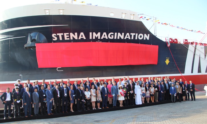 April 19, 2017 Yesterday afternoon, with temperatures close to 40o C, the MR tanker Stena Imagination was named in the Port Rashid Terminal in the heart of Dubai. Some 100 guests from near and far attended the solemn ceremony and godmother Lourdes Torgersen who, as tradition dictates, wished the vessel, her captain and his crew fortune and prosperity on the seven seas. All the guests were also given the opportunity, led by Captain Alexander Vasko, to inspect the vessel from her engine room all the way up to the bridge. On Sunday, the Stena Imagination will leave for East Africa with a cargo of diesel oil. “Naming the Stena Imagination in Dubai is very much a strategic choice. Stena Bulk recently opened an office here together with Stena Weco and Golden Stena Weco. We already had a presence in the market in the region but wanted to get even closer to our customers. The naming ceremony gives us the opportunity to further reinforce our image and forge more contacts with customers, partners and suppliers in the region”, says Erik Hånell, President & CEO of Stena Bulk and CEO of Stena Weco. Dubai is an important meeting-place for the oil industry in the Middle East. Stena’s tanker business already has a presence in the area with contacts in the neighbouring region. For Stena Bulk and Stena Weco, which, with their IMOIIMAX fleet, are focusing increasingly on trade in chemicals, Dubai is an important hub. Here, the oil industry is building several refineries closer to the oil wells in the region. Stena Weco is now wholly owned by Stena Bulk while Golden Stena Weco is a joint venture between Stena Weco and Golden Agri Resources (GAR). With its new office in Dubai, Stena Bulk now does business in six countries. In addition to Dubai, it has offices in Houston, Copenhagen, Singapore and Shanghai while its head office is located in Gothenburg. The Stena Imagination was built at the Chinese shipyard GSI (Guangzhou Shipbuilding International) like all the 13 IMOIIMAX tankers ordered by Stena Bulk – both delivered and under construction. The vessel is jointly owned on a 50-50 basis by Stena Bulk and Indonesian Golden Agri Resources (GAR). The Stena Imagination is operated by Stena Weco and sails in the company’s global logistics system, which currently employs more than 60 vessels. Deliveries of IMOIIMAX tankers 2015: Stena Impression, Stena Image, Stena Imperial and Stena Important 2016: Stena Imperative, Stenaweco Impulse, Stena Imagination, Stena Immortal, Stena Immaculate and Stena Impeccable. The remaining three vessels will be delivered by 2018. Five of the 13 IMOIIMAX tankers are wholly owned by Stena Bulk, four together with GAR (Golden Agri Resources), two by Stena Bulk’s sister company Concordia Maritime and two by Stena Weco.