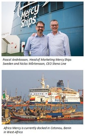 Mon, Feb 13, 2017 The humanitarian NGO Mercy Ships and Stena Line, the world’s largest privately owned ferry company, have decided to enter a long-term partnership. The goal is to raise general awareness about the charity, promote volunteering and charitable giving both within Stena Line itself as well as amongst its travellers and partners. Mercy Ships owns and operates the largest civilian hospital-ship in the world to deliver free, world-class health care services to the poorest of the poor together with capacity building and sustainable development to nations in the developing world. Since 1978 Mercy Ships has helped more than 2.5 million people. The ship’s crew is made up of more than 400 volunteers from up to 40 nations. Surgeons, nurses, technical, marine and many other professionals, an average of a 1000 volunteers yearly, pay their own expenses to aid those in need of safe surgical expertise and healthcare. “We have found a partner with the right qualifications and commitment who, like us, sees the advantages and flexibility in having the sea and ships as workplace. Care is part of our soul which means that our sustainability work includes more than just environmental initiatives. Our partnership with Mercy Ships now becomes an important part of that work and it gives us an exciting opportunity to involve our staff, customers and partners in making a difference.” says Niclas Mårtensson, CEO at Stena Line. “Mercy Ships is a unique organization and we very pleased to see the great support from Stena Line. They have taken our mission to their heart and it is great to see their willingness to partner with us to support the work we do”, stated Pascal Andréasson, Head of Marketing for Mercy Ships Sweden. At the end of January, Stena Line’s CEO Niclas Mårtensson visited the Africa Mercy , currently docked in Cotonou Benin, to see for himself the work done on-board. The Mercy Ship is a former Scandinavian rail ferry which was converted to a hospital ship with five operating theatres and spends ten months at a time in African port cities. The impressions at the visit were many and Niclas Mårtensson says: “I see the great need to support Africa, where Mercy Ships with their volunteers, their commitment and knowledge, make an enormous difference. During the stay on-board the vessel in West-Africa, where I met patients and saw the operation of the organisation, I realized that this is a life-changing contribution. To see and experience this is a very important experience for me.” Stena Line’s vessels and social channels will be able to reach some 10 million people every year with information about Mercy Ships. During the spring of 2017 Stena Line will cooperate with Mercy Ships Sweden to bring awareness of the charity’s commendable cause on their vessels in all of Europe. Stena Line is also presently working to set up a programme for sponsoring staff/crew who would like to join as volunteers on Mercy Ships vessels. About Stena Line: Stena Line is one of Europe's leading ferry companies with 36 vessels and 20 routes in Northern Europe. Stena Line is an important part of the European logistics network and develops new intermodal freight solutions by combining transport by rail, road and sea. Stena Line also plays an important role for tourism in Europe with its extensive passenger operations. The company is family-owned, was founded in 1962 and is headquartered in Gothenburg. Stena Line is part of the Stena AB Group, which has about 15 000 employees and an annual turnover of around 37 billion SEK. www.stenaline.com About Mercy Ships: Mercy Ships uses hospital ships to deliver free, world-class health care services, capacity building and sustainable development to those without access in the developing world. Founded in 1978 by Don and Deyon Stephens, Mercy Ships has worked in more than 70 countries providing services valued at more than $1.3 billion, treating more than 2.5 million direct beneficiaries. Each year Mercy Ships efforts involve an average of 1,000 volunteers from up to 40 nations. For more information click on www.mercyships.org Stena Line, press release |