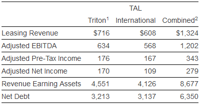 Under the terms of the transaction agreement, Triton and TAL International will combine under a newly-formed holding company, Triton International Limited (“Triton International”), which will be domiciled in Bermuda and is expected to be listed on the New York Stock Exchange. Triton shareholders will own 55% of the equity of the combined company and TAL International shareholders will own 45%. TAL International shareholders will receive one common share of Triton International for each share of TAL International stock owned. TAL International shareholders will also receive a special dividend of $0.54 per share upon closing of the transaction. Company Backgrounds Triton was founded in 1980 and is currently owned by Warburg Pincus LLC and Vestar Capital Partners, along with other private investors, including members of Triton management. Triton operates a container fleet of 2.4 million TEU, services its customers through 19 subsidiary offices in 13 countries and is domiciled in Bermuda. TAL International was founded in 1963 and has been publicly listed since 2005. TAL International operates a container fleet of 2.4 million TEU, services its customers through 17 offices in 11 countries and is domiciled in Delaware. Transaction Highlights • A merger of Triton and TAL International will create the world’s largest and most efficient intermodal container leasing company with a container fleet of 4.8 million TEU, resulting in industry cost leadership and an enhanced container supply capability. • The combined company expects to realize $40 million per year in annual SG&A synergies, by aligning infrastructure and creating a best-in-class systems environment. The cost savings are expected to be fully implemented by the end of 2016. • The transaction is expected to be approximately 30% accretive to net income per share for TAL International’s existing shareholders when cost savings are fully realized. • The regional and product line strengths of Triton and TAL International are highly complementary. The combined company will offer its customer base a broad range of container types and will maintain close customer relationships across all major geographic locations. • Consummation of the transaction will not require any incremental leverage and existing debt facilities at Triton and TAL International will largely remain in place. • The new company expects to implement an annual dividend of $1.80 per share and intends to adopt a share repurchase plan of up to $250 million following the close of the transaction. The planned share repurchase program will be completed using the company’s existing liquidity, and will supplant TAL International’s recently announced $150 million buyback program. Ed Schneider, Co-Founder and Chairman of the Board, Triton, stated, “This transaction will create a company with deep industry knowledge, enhanced operating and systems capabilities and expanded fleet size. Both Triton and TAL International have well-earned reputations for competence and reliability with our customers, suppliers and capital providers. We are proud of what Triton has accomplished over the last 35 years and we believe that joining forces with TAL International is a next logical step in our evolution. We look forward to bringing together our similar cultures of dependability, high quality customer service and teamwork.” Brian Sondey, President and Chief Executive Officer, TAL International, stated, “This is a transformational transaction. The new company’s enhanced capabilities, larger scale and improved cost competitiveness will better position it in the current soft operating environment and provide valuable operating leverage when the market recovers. In addition, our customers will benefit from significantly expanded supply capabilities, the industry’s best container build quality and top-tier customer service. Both Triton and TAL International have delivered industry-leading returns over the last ten years, and we are very excited to work together to continue this tradition of success as a larger, stronger, more profitable company.” Simon Vernon, President and Chief Executive Officer, Triton, stated, “Bringing together our two highly compatible companies is a powerful combination that will deliver a number of compelling strategic and financial benefits to the stakeholders of both companies. The product line and customer strengths of Triton and TAL International are highly complementary, which will allow us to preserve the core strengths of each company. We also share a strong commitment to container quality, investment discipline and operational excellence. Both organizations are focused on making the integration as seamless as possible for our respective customers and suppliers. TAL International will be an excellent partner for us and we are looking forward to bringing these two outstanding companies together.” Financial Highlights The following table summarizes the historical financial highlights for Triton and TAL International as of and for the twelve months ended September 30, 2015 (dollars in millions).