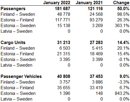 3 February 2022 In January 2022 AS Tallink Grupp transported 181 687 passengers, which is an 50.0% increase compared to January 2021. The number of cargo units increased by 14.4% to 31 213 units and the number of passenger vehicles increased by 9.0% to 40 808 units in the same comparison. AS Tallink Grupp passenger, cargo unit and passenger vehicles numbers for January 2022 were the following: