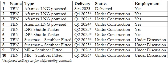 TEN's diversified energy fleet currently consists of 68 double-hull vessels, including four dual-fuel LNG powered aframax vessels, two DP2 shuttle tankers, two scrubber-fitted suezmax vessels and two scrubber-fitted MR product tankers under construction, constituting a mix of crude tankers, product tankers and LNG carriers, totaling 8.4 million dwt. Tsakos Energy Navigation press release