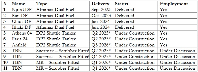 TEN's diversified energy fleet currently consists of 74 double-hull vessels, including four DP2 shuttle tankers, two scrubber-fitted suezmax vessels and two scrubber fitted MR product tankers under construction, constituting a mix of crude tankers, product tankers and LNG carriers, totaling 9.1 million dwt. Tsakos Energy Navigation press release