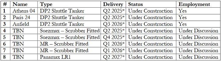 TEN's diversified energy fleet currently consists of 75 vessels, including three DP2 shuttle tankers, two scrubber-fitted suezmax vessels and two scrubber-fitted MR product tankers under construction, consisting of a mix of crude tankers, product tankers and LNG carries, totaling over 9.0 million dwt. Tsakos Energy Navigation press release