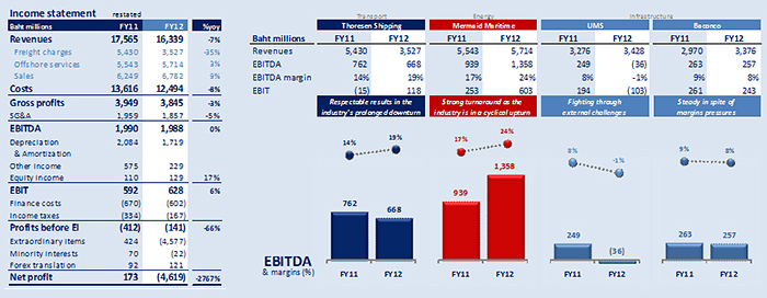 “2012 was a year of restructuring, transition, and difficult decisions for TTA. On the positive front, we have seen significant fundamental improvements for our largest business units, Thoresen Shipping and Mermaid. However, we face prolonged challenges at UMS and will make every effort to reopen its Samut Sakorn plant in the shortest possible time,” said M.L. Chandratat. “It was particularly gratifying to see Thoresen Shipping boost its fourth quarter EBIT by nearly 50% compared to the previous quarter. This came largely as a result of adding the Thor Insuvi to the fleet and chartering in the equivalent of 1.3 additional vessels during the quarter. This proves that Thoresen Shipping is ready to scale up even in an environment of depressed freight rates, something that will be of particular focus in our capital increase plan. “At the same time, Mermaid continues to make excellent progress forging close relationships with oil and gas majors in South East Asia, the Middle East, and beyond. The offshore oil and gas services business is clearly in a cyclical upturn, and Mermaid has found itself in situations where it has turned down work due to a lack of available assets. The tender rig segment is an area we see great potential in, and Mermaid’s board has asked for strategic options. TTA is ready to support Mermaid’s potential expansion plans.” Group Transport Group Transport contributed THB 775 million in losses during the year, primarily due to THB 909 million in one-time write-offs and impairment charges. Excluding these extraordinary items, Group Transport would have contributed THB 133 million in net profits, a formidable result given prolonged weakness in the global dry bulk industry. Two of these extraordinary items occurred during the first quarter while the third, a THB 501 million fixed asset impairment charge, was taken in the fourth quarter against a USD 16 million novation fee paid to acquire new build vessels from Vietnam Shipbuilding Industry Group (“Vinashin”) at the height of the dry bulk market. Thoresen Shipping’s normalised EBIT for the fiscal year jumped 886% to THB 118 million from a negative normalised EBIT of THB 15 million a year ago. Strategic moves, including fleet reconfiguration, relocation of the commercial hub to Singapore, a tighter focus on costs, and improved on-board maintenance initiatives, have all proven successful in delivering positive results despite a year of highly depressed global freight rates. Petrolift, Inc. (“Petrolift”)’s performance softened slightly during the year as revenues during the second half of the year were impacted by poor weather conditions, which delayed the dry-docking of two vessels. EBITDA both in absolute terms and margins, however, remained strong with Petrolift contributing a formidable 12% return on investment throughout the fiscal year. “The dry bulk industry was hit with 25-year low freight rates in 2012, a fact that makes Thoresen Shipping’s positive normalised contribution that much more impressive,” said Mr. David Ames, Executive Vice President, Group Transport. “On a full year basis, our owner expenses averaged about USD 3,952 per day, placing Thoresen Shipping in the top quartile of owner expenses worldwide. We were able to garner these results through a renewed focus on cost controls, evidenced by operating expenses dropping by 32% year-on-year. While the freight rate outlook for next year remains largely flat, there is little doubt that Thoresen Shipping will be able to ride out the downturn and be set to capitalise on a cyclical upturn which we expect to begin taking shape in 2014.” Group Energy Driven largely by a turnaround at Mermaid, Group Energy contributed THB 24 million in profits, compared to losses of THB 110 million in 2011. The improvement was largely driven by a turnaround at Mermaid, which has both streamlined its operations and increased its market penetration in time to begin capitalising on an industry upturn in the oil and gas industry. Mermaid’s total revenues rose 3% to THB 5,714 million, but the Company’s margins improved significantly, with gross profit rising 19% to THB 1,944 million and EBIT climbing 138% to THB 603 million. The improvements came on the back of aggressive vessel and project cost management, the employment of Mermaid’s MTR-1 accommodation barge after being off-hire for a year, and higher full-service contract rates for the subsea division. Mermaid has been working towards a subsea fleet optimisation strategy to focus on higher vessel yields and increased market penetration in high growth areas, such as the Middle East and Africa. This push materialised in several significant deals, particularly in the Middle East throughout the year and in the early part of fiscal year 2013. TTA’s plan to directly invest in its Philippines coal venture by converting debt into equity has not yet been approved by local regulators, pending legal motions raised by other companies about foreign share ownership restrictions for Philippine companies engaged in mining. Because the debt to equity conversion has not taken place, the financial position of SKI Energy Resources Inc. (“SERI”) has weakened, and the venture is not able to produce sufficient coal to reach break-even cash flows. In line with its policy for conservative accounting and reporting, TTA has taken a THB 908 million doubtful debts provision while it explores options to restructure SERI, including evaluating alternate debt to equity scenarios or finding other partners to capitalise the business properly. “We are very pleased to see Mermaid make the turnaround it has, a momentum that has been further buoyed by additional significant deals early in fiscal year 2013, most notably with Saudi Aramco, the largest oil and gas company in the world. That deal, signed with a Mermaid JV for USD 530 million over five years, will give Mermaid a share of 60%-70% of the contract amount,” said M.L.