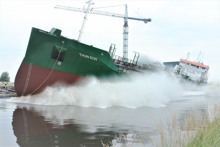 June 18th, 2018 On Saturday 16th of June, Nb. 443 was successfully launched at the Ferus Smit Shipyard in Westerbroek, The Netherlands. The naming ceremony was performed by Sofia Wessman from the Källsson Family. After the ceremony the launching went smoothly. ”Thun Eos” is the first vessel in a series of four new vessels in the E-class. The design is a further development of Thun Tankers’ existing fleet. Focus on efficiency, new regulations, environmental care and customers’ needs has been key when evolving the new vessels that will be built to the absolute latest design. ”Thun Eos” has a deadweight of 7.999 tons and the LOA is almost 115 meters. Breadth moulded is 15,80 meters and the speed is 13 knots. The main engine is a Wärtsilä type 6L32/6L34DF for LNG or gas oil usage and she has a nozzle fitted, 3,85 meter diameter controllable pitch propeller.