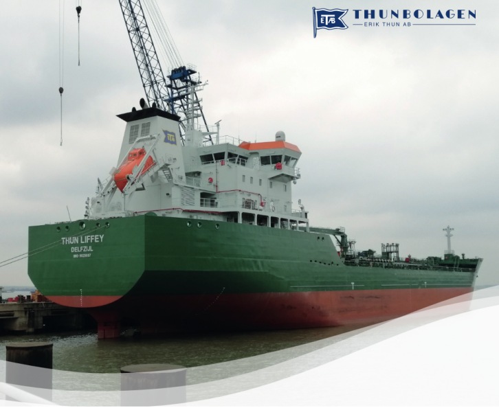 17 April 2020 Today, Thun Tankers took delivery of the fourth L-class, Thun Liffey, at China Merchants Jinling Shipyard (former known as AVIC Dingheng) in China. Just like her sister ships - Thun Lidkoping, Thun London & Thun Liverpool - she will enter the Gothia Tanker Alliance network. On Thursday 16th, Thun Tankers took delivery of the 18,650-deadweight product tanker “Thun Liffey”. This L-class vessel is the fourth in a series of five resource efficient, high quality tankers built by China Merchants Jinling Shipyard Dingheng CO Ltd in China. The L-class series have been designed and developed in-house, using the Erik Thun group’s long experience of building sustainable, high quality vessels. Focus on environmental care, new regulations and customers’ needs has been key in the design and building process of this vessel type. Erik Thun Group and Thun Tankers would like to specifically thank the vessel's crew, the team in MF Shipping Group and the yard for their efforts to complete and successfully deliver the “Thun Liffey”. The new tanker will enter into the Gothia Tanker Alliance network with crewing and technical management done by MF Shipping Group.