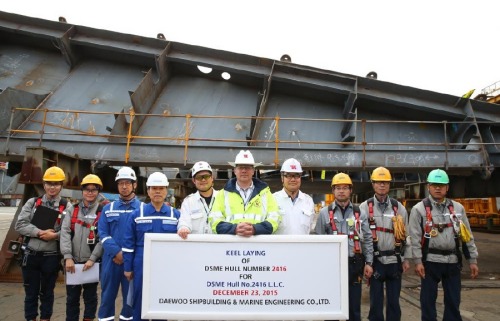 Newbuildings January 12, 2016 Last December our Gas team celebrated the keel laying ceremony of six LNG newbuildings – H2416/17/53/54/55/61. Five of these 173,400 cubic meter MEGI (M-type, Electronically Controlled, Gas Injection) engine LNG newbuildings are under time-charter contracts with Royal Dutch Shell plc (Shell). The remaining, H2461, is committed to the Bahrain project. The newbuildings are currently under construction at the Daewoo Shipbuilding & Marine Engineering (DSME) shipyard in South Korea and are expected to deliver between 2017 and 2018. The six blocks, as shown in the pictures, total a significant weight of over 50 tons. Teekay Corporation press release |