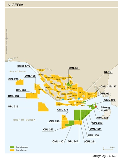 Total’s onshore production comes from OML 58, which it also operates as part of its joint venture with NNPC. The principal assets are the Obagi oil field and the Ibewa natural gas field. A project is underway to increase the lease’s natural gas and condensate production capacity to supply the domestic market.