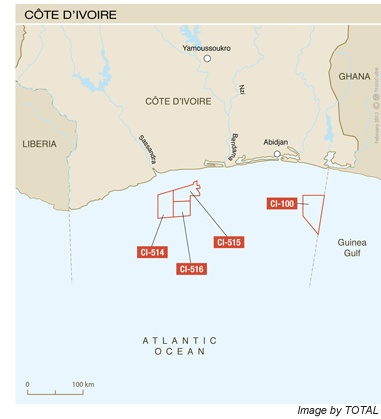 Paris, February 17, 2012: Total announces the signature of production sharing agreements with the Côte d’Ivoire state and national oil company Petroci for three new ultra-deep offshore licenses. Total will operate the CI-514 license with a 54% interest, in partnership with Canadian Natural Ressources International (36%) and Petroci (10%). Total will also hold a 45% interest in the CI-515 and CI-516 licenses, alongside Anadarko (45%) and Petroci (10%). For each block Total will become the operator upon the first commercial discovery.