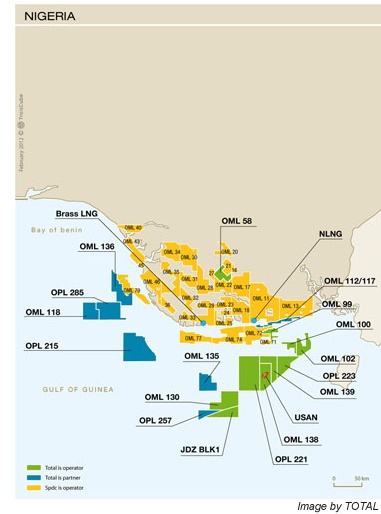 Total’s onshore production comes from OML 58, which it also operates as part of its joint-venture with NNPC. The principal assets are the Obagi oil field and the Ibewa natural gas field. A project is underway to increase the lease’s natural gas and condensate production capacity to supply the domestic market.