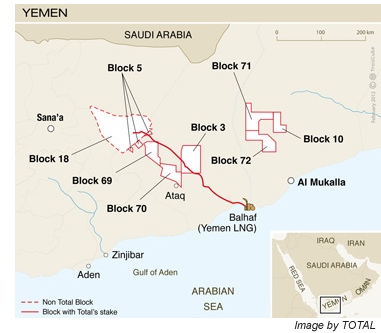 Total is also the main shareholder (39.62%) in Yemen LNG, which operates a liquefaction plant in Balhaf, on the southern coast. The plant started production in 2009 and is supplied with feed gas from Block 18 in central Yemen’s Marib region via a 320 kilometers gas pipeline. The plant has a nominal capacity of 6.7 million metric tons of liquefied natural gas (LNG) per year.