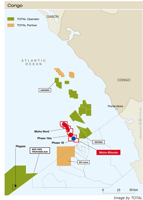 Total, operator of the Moho-Bilondo license, today announces the final investment decision and EPC contract awards for the Moho Nord development, consisting of the Moho-Bilondo Phase 1bis and Moho Nord projects. First oil is expected in 2015, with output reaching 140,000 barrels of oil equivalent per day (boe/d) in 2017. The joint development represents an investment of US$10 billion.