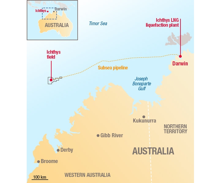 Paris - October 23, 2018 Total announces that the first cargo of liquefied natural gas (LNG) from Ichthys LNG has left Darwin, in the Northern Territory of Australia, following the production start-up at the end of July. Ichthys LNG will develop reserves of more than 3 billion barrels of oil equivalent located offshore Western Australia, including around 500 million barrels of condensate. At full capacity, the offshore facilities and the two-train onshore liquefaction plant will supply 8.9 million tons per year (Mt/y) of LNG and 1.65 Mt/y of liquefied petroleum gas (LPG), along with 100,000 barrels of condensate per day. LNG is currently being produced from the first liquefaction train, with the second train expected to start up as well in the coming weeks. About Ichthys LNG Ichthys LNG is led by INPEX (operator, 62.245%) alongside major partner Total (30%) and the Australian subsidiaries of CPC Corporation Taiwan (2.625%), Tokyo Gas (1.575%), Osaka Gas (1.2%), Kansai Electric Power (1.2%), JERA (0.735%) and Toho Gas (0.42%). The project involves: Two offshore floating platforms The Ichthys field and its offshore production facilities are located approximately 220 km off the coast of Western Australia. Two offshore facilities anchored in 250 meters of water and supplied by a subsea production network operate in tandem: a semi-submersible platform (CPF, Central Processing Facility) for gas treatment, linked to an FPSO (Floating Production, Storage and Offloading) facility for condensate production and export. A subsea pipeline to the LNG plant A 890-km-long subsea gas pipeline connects the CPF to the liquefaction plant near Darwin. An onshore liquefaction plant The onshore gas liquefaction is located at Bladin Point, near Darwin in the Northern Territory. It consists of two LNG trains with a combined capacity of 8.9 million tons per year and facilities for the extraction and the export of LPGs and condensate.