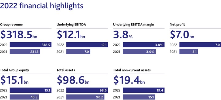Profit for the year of USD7,026 million was more than double the previous year's level of USD3,075 million. Revenues increased by 38 percent to USD318,476 million from USD231,308 million in 2021. The Group's underlying earnings before interest, tax, depreciation and amortisation (EBITDA) margin for the year was 3.8 percent, compared to 3.0 percent in 2021. The total volume of commodities traded in 2022 was lower year-on-year. This was due to a reduction in oil and petroleum products volumes in the second half of the financial year, driven by the termination of long-term contracts for Russian crude oil and products in light of international sanctions, reduced availability of hedging in derivatives markets used to manage price risk, and a decision to focus on higher-margin opportunities. Trafigura traded an average of 6.6 million barrels of oil and petroleum products per day in the financial year 2022, compared to the daily average of 7.0 million barrels in 2021. Non‑ferrous metals traded volumes were flat at 23.3 million metric tonnes, while bulk minerals volumes, driven by increased iron ore volumes, rose by 10 percent to 91.3 million metric tonnes. The strong performance allowed for a further strengthening of the balance sheet, with Group equity almost doubling over the past two years to USD15.1 billion. An additional USD7 billion of financing was secured in financial year 2022, bringing total credit lines to USD73 billion, provided by a network of around 140 banks globally1. Jeremy Weir, Trafigura's Executive Chairman and Chief Executive Officer said: "The past year saw our people work hard to solve the disruptions created by unprecedented market volatility and the big structural shifts that are shaping our industry. It has shown that what we do - connecting vital resources to help power and build the world - has not only become more complex but also more critical and in demand than ever before." Additional key points: • The Group responded to new rules and regulations that came into force across multiple jurisdictions following Russia's invasion of Ukraine. Long-term contracts with Russian state-owned entities were terminated ahead of sanctions taking effect in May and its sole investment in Russia - a 10 percent minority stake in Vostok Oil - was exited in a transaction that completed in July. • In its first full year following consolidation, Puma Energy's management team divested a significant part of its infrastructure and storage assets, as part of a wider plan to refocus the business on downstream operations and to reduce debt. • The Group was part of a consortium awarded the concession to refurbish and operate a near 1,300 km railway running from the Lobito port on the Atlantic coast of Angola to the border with the Democratic Republic of Congo. The Lobito Atlantic railway will offer a western route to market for crucial energy transition metals that is safer and less congested or prone to delay than existing eastern and southern routes. The project is expected to require a total investment of USD450 million over a 30-year concession, including USD170 million investment in new rolling stock. • Nyrstar recorded a loss due to operational issues in Australia and soaring power prices which forced the company to curtail production at its European smelters. • Nala Renewables, a 50:50 joint venture between Trafigura and fund management group IFM Investors, continued to develop a number of solar power, onshore wind and battery storage investments to progress towards its 4GW renewable energy target by 2025. Trafigura has also made a string of early stage investments in companies involved in new energy technologies and continues to see hydrogen‑derived fuels as one of the key commodities of the future. • Our joint venture H2 Energy Europe is working towards a final investment decision on a project to build a one gigawatt renewable hydrogen production plant in Denmark, to provide zero‑carbon fuel for trucks and other heavy transport vehicles. • In its first full year of operation, the Group's Carbon Trading team continued to build its capabilities and investments across regulatory and voluntary carbon markets, including becoming an anchor buyer of nature-based carbon removals from the Delta Blue Carbon mangroves restoration project in Pakistan. • Good progress has been made to reduce greenhouse gas emissions from operations by 30 percent compared to a 2020 baseline. Longer-term targets will be announced in the Group's 2022 Sustainability Report, to be published in January. "Whilst the new financial year has started well, we need to remain focused and vigilant in a period that is likely to be at least as challenging as 2022. Trafigura is well positioned to continue to manage the challenges and supply the vital resources our customers need in the year ahead," concluded Jeremy Weir. Full report About Trafigura Founded in 1993, Trafigura is one of the largest physical commodities trading groups in the world. At the heart of global supply, Trafigura connects the world with the vital resources it needs. Through our Oil & Petroleum Products, Metals & Minerals, and Power & Renewables divisions, we deploy infrastructure, skills and a global network to move commodities from where they are plentiful to where they are needed most, forming strong relationships that make supply chains more efficient, secure and sustainable. Trafigura also owns and operates a number of industrial assets including multi-metals producer Nyrstar and fuel storage and distribution company Puma Energy; and joint ventures Impala Terminals, a port and logistics provider, and Nala Renewables, a power and renewable energy investment and development platform. Trafigura is owned by its employees and employs over 12,000 people working in 61 countries. Trafigura Group Pte. Ltd. press release