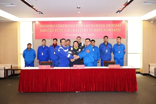 Jiangnan Shipyard personnel at the offical launch ceremony for UECC’s third newbuild dual-fuel battery hybrid PCTC Photo: Jiangnan Shipyard UECC press release