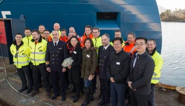 02 March 2017 The ‘Windea Leibniz’ wind farm service vessel was delivered on-time from Ulstein Verft to Bernhard Schulte Offshore and ICBC Leasing on 28 February, and named today at a ceremony in Ulsteinvik. The vessel will shortly commence service at the Sandbank wind farm for Siemens. The lady sponsor, Dai Ling, named the second wind farm service vessel of the Hamburg based shipping company Bernhard Schulte and the Beijing based financial company ICBC Leasing. The vessel carries the name of the German mathematician, philosopher and physicist Gottfried Wilhelm von Leibniz, who in the 17th century proposed to use wind power to operate pumps. The naming ceremony was held in Ulsteinvik, Norway, at the Ulstein Verft yard premises. The vessel has been designed by Ulstein Design & Solutions AS. “Once again, Ulstein Verft proves the ability to deliver state-of-the-art vessels to the agreed time. We look forward to seeing the vessel at work, and hear the feedback of her results when operating in the renewable market,” says managing director Kristian Sætre at Ulstein Verft. Work scope Starting from April, the vessel will work at the Sandbank wind farm in the German Bight for Siemens Wind Power Service to ensure the production of green energy from 72 wind turbines. The usage of the so-called Service Operation Vessels (SOV) will improve the efficiency of service operations at offshore wind farms. The vessel functions as a reliable and environmentally sound platform for wind farm operations and maintenance support, technician accommodation and transport, and the provision of exceptional levels of safe and reliable access to offshore installations. X-STERN™ “The vessel has the X-STERN™ hull shape, which allows it to be positioned with the stern faced towards the weather instead of the bow only”, said Matthias Müller, Managing Director of Bernhard Schulte Offshore. He continued: “Her award-winning sister vessel ‘Windea La Cour’, which is working in the Dutch Gemini wind farm since August, has already proven that this leads to improved weather resilience, greater operability and reduced power and fuel consumption while on DP mode next to the wind turbine.” Bernhard Schulte Offshore GmbH is the offshore unit of Bernhard Schulte, a worldwide leading family owned ship owner and ship manager which employs about 17,000 seafarers and about 1,400 people onshore, owns about 90 vessels and manages about 580 vessels. Video by Ulstein Group