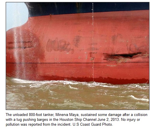 There has been no report of pollution or injury from either vessel. The unloaded 800-foot tanker, Minerva Maya, is reporting damage to the port bow and the five barges being pushed by the tug, M.L. Crochet, sustained some damage. All vessels are currently secured and in stable condition.