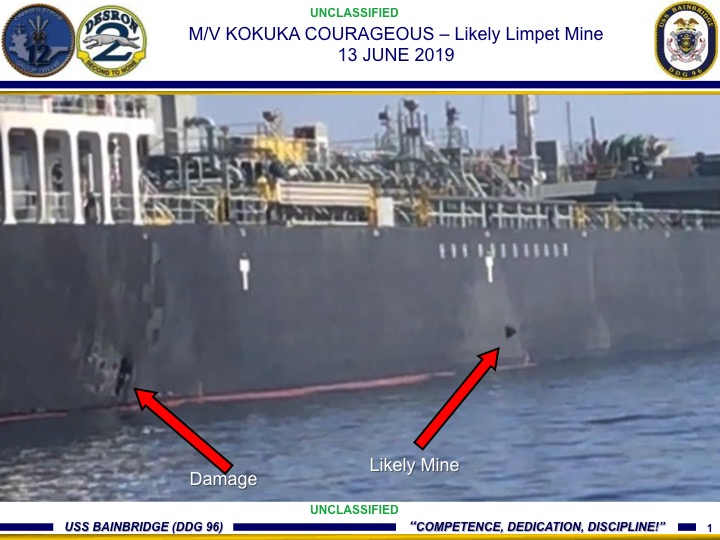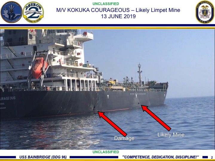 By Capt. Bill Urban, U.S. Central Command Public Affairs Tampa - 13 June 2019 U.S. Naval Forces in the region received two separate distress calls at 6:12 a.m. local time from the motor tanker (M/T) Altair and a second one at 7a.m. local time from the M/T Kokuka Courageous. Both vessels were in international waters in the Gulf of Oman approximately 10 nautical miles apart at the time of the distress calls. USS Bainbridge was approximately 40 nautical miles away from the M/T Altair at the time of the attack, and immediately began closing the distance. At 8:09 a.m. local time a U.S. aircraft observed an IRGC Hendijan class patrol boat and multiple IRGC fast attack craft/fast inshore attack craft (FAC/FIAC) in the vicinity of the M/T Altair. At 9:12 a.m. local time a U.S. aircraft observes the FAC/FIAC pull a raft from the M/T Altair from the water. At 9:26 a.m. local time the Iranians requested that the motor vessel Hyundai Dubai, which had rescued the sailors from the M/T Altair, to turn the crew over to the Iranian FIACs. The motor vessel Hyundai Dubai complied with the request and transferred the crew of the M/T Altair to the Iranian FIACs. At 11:05 a.m. local time USS Bainbridge approaches the Dutch tug Coastal Ace, which had rescued the crew of twenty-one sailors from the M/T Kokuka Courageous who had abandoned their ship after discovering a probable unexploded limpet mine on their hull following an initial explosion. While the Hendijan patrol boat appeared to attempt to get to the tug Coastal Ace before USS Bainbridge, the mariners were rescued by USS Bainbridge at the request of the master of the M/T Kokuka Courageous. The rescued sailors are currently aboard USS Bainbridge. At 4:10 p.m. local time an IRGC Gashti Class patrol boat approached the M/T Kokuka Courageous and was observed and recorded removing the unexploded limpet mine from the M/T Kokuka Courageous (video attached). Image by US Navy Image by US Navy Video by US Navy The U.S. and our partners in the region will take all necessary measures to defend ourselves and our interests. Today's attacks are a clear threat to international freedom of navigation and freedom of commerce. The U.S. and the international community, stand ready to defend our interests, including the freedom of navigation. The United States has no interest in engaging in a new conflict in the Middle East. However, we will defend our interests. US Navy press release