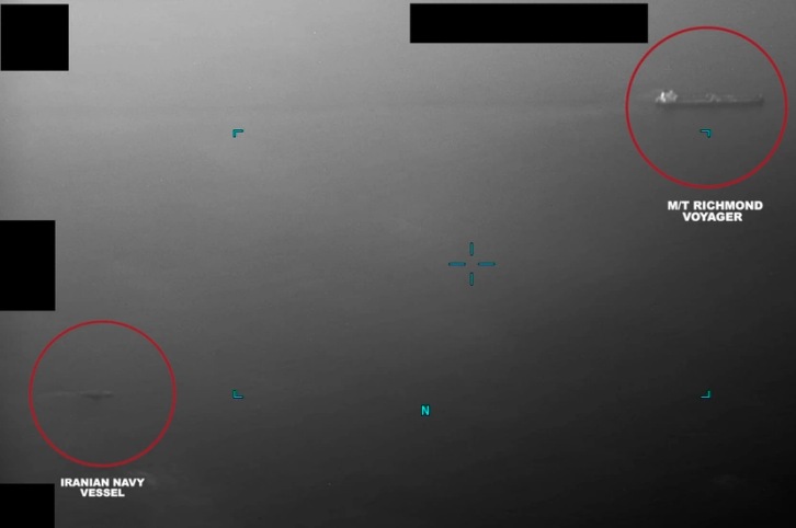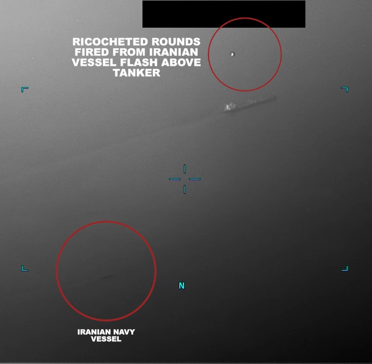 An Iranian naval vessel approaches and fires shots at M/T Richmond Voyager transiting the Gulf of Oman, during an attempted unlawful seizure by Iran, July 5, 2023. (U.S. Navy video). (Photo by U.S. Naval Forces Central Command Public Affairs)