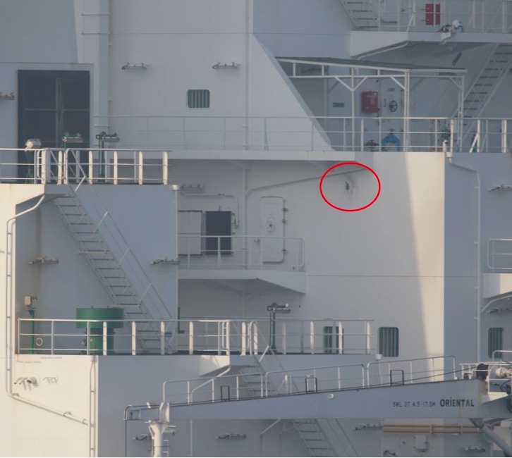 Image of damage sustained by M/T Richmond Voyager after personnel from an Iranian naval vessel fired multiple long bursts of rounds from small arms and crew-served weapons during an attempt to unlawfully seize the commercial tanker in the Gulf of Oman, July 5, 2023. (Photo by U.S. Naval Forces Central Command Public Affairs) US Navy press release