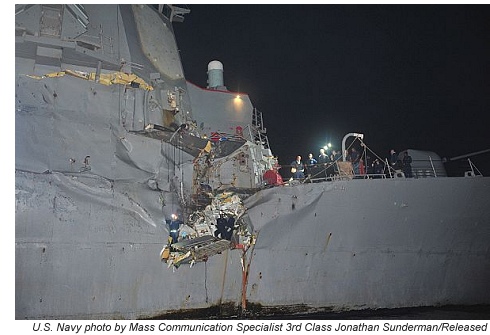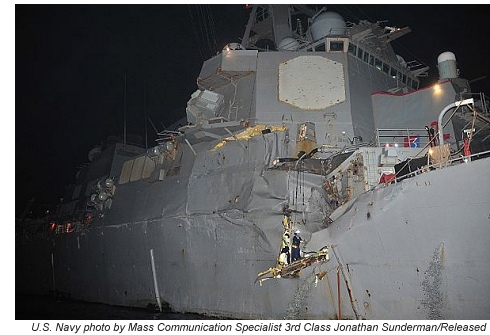 NAVAL SUPPORT ACTIVITY, Bahrain (NNS) - No one was hurt Sunday morning when a U.S. Navy guided missile destroyer and a large Japanese owned merchant vessel collided near the Strait of Hormuz.