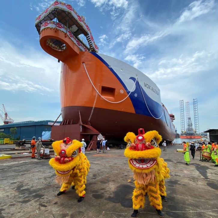 7 April 2022 Last weekend Van Oord's new trailing suction hopper dredger Vox Alexia was launched in Singapore. Vox Alexia is one of the three LNG trailing suction hopper dredgers that are currently being built at Keppel Offshore & Marine's shipyard in Singapore. Sustainable ambitions The vessel will boost the mid-class section of our fleet of trailing suction hopper dredgers. This state-of-the-art vessel is fitted with an LNG installation and is a fine example of Van Oord's sustainability ambition. CFO Jolanda Poots-Bijl had the honour of performing the launching ceremony. Boost the market These three new LNG trailing suction hopper dredgers have a significantly lower carbon footprint than conventional trailing suction hopper dredgers. Nitrogen oxides and particulate emissions are also minimal with this new generation of hopper dredgers. By 2023, we will have a dredging fleet with three new LNG hopper dredgers to boost the dredging market.