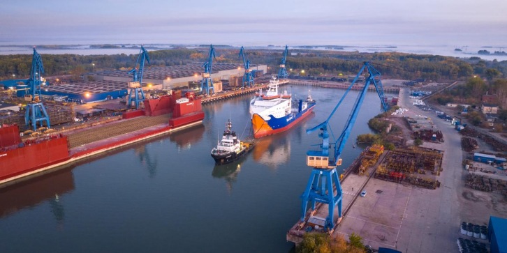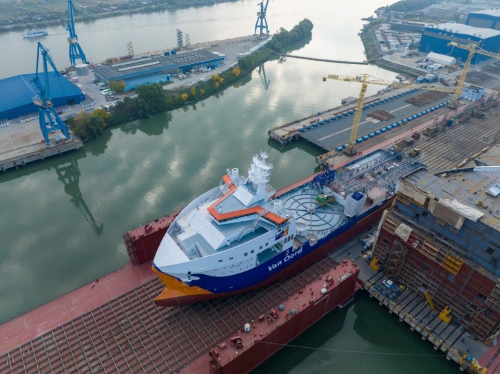 Rotterdam, the Netherlands - 26 October 2022 Van Oord's new cable-laying vessel Calypso is on its way to the Vard Brattvaag yard in Norway for construction finishing, after a successful and safe launch at the Vard Tulcea shipyard in Romania, last week. This next-generation, custom-built vessel will be a key strategic addition to Van Oord's offshore wind fleet, being equipped with the latest sustainable technologies. Construction is progressing well on schedule and the vessel is expected to be operational from the end of 2023 on. The Calypso is Van Oord's second cable-laying vessel in addition to the Nexus. It measures 131 metres in length and 28 metres across the beam and will be Dutch flagged. The new DP2 vessel will not only be fitted with a carousel on deck but also with a second, below-deck cable carousel, with a total cable-carrying capacity of 8,000 tonnes. Offshore wind is a key contributor to achieving climate change targets around the world. By investing in state-of-the-art sustainable technology, Van Oord contributes to the energy transition, making offshore wind more competitive. The Calypso will mainly be deployed to install inter-array grid and export cables for offshore wind projects, including high-voltage direct current (HVDC) cables. Van Oord's highly innovative cable trenchers can also be operated from the vessel.
