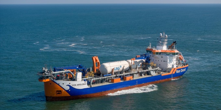 Rotterdam, The Netherlands - 17 January 2024 Van Oord has been contracted by FSRU Wilhelmshaven (a joint venture between ENGIE and TES, Tree Energy Solution) to construct a Floating Storage and Regasification Unit (FSRU) jetty at Wilhelmshaven in Germany. Responsibility for the operation of the second FSRU-Project in Wilhelmshaven lies with the state-owned DET (Deutsche Energy Terminal GmbH), which is implementing - together with its partners TES and Engie - one of the priority projects backed by Germany's LNG Acceleration law, passed in May 2022. This law aims to plug the supply gap and bolster Germany's security of supply when it comes to energy. Van Oord is offering a unique concept by combining its wide range of marine services. To meet the growing energy demand, it is crucial to have energy facilities that are both efficient and safe. Van Oord is dedicated to offering safe and efficient solutions to provide and protect such infrastructure. In Wilhelmshaven, Van Oord is responsible for the procurement and construction of the FSRU jetty. Leveraging its experience in dredging, infrastructure and offshore energy, Van Oord is fully mobilised to ensure the successful implementation of the project within an ambitious timeline. To expedite the process, monopiles are used as the foundation for the jetty. Van Oord is installing a total of 10 monopiles, including scour protection. The foundations are equipped with platforms, catwalks and furniture. In addition, a trailing suction hopper dredger is being deployed to dredge the berth pocket and turning basin. August Runge, Commercial Director at Van Oord: "We are proud to be part of this project, leveraging our extensive portfolio of marine capabilities. Through the synergy of our expertise, experience and cutting-edge equipment, we were able to provide a tailor-made integrated solution to our client's challenge."