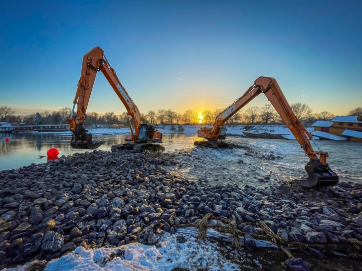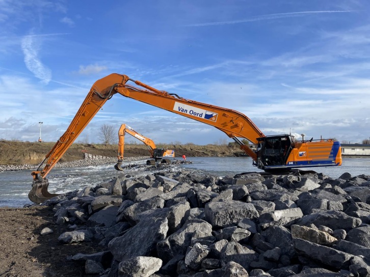 Rotterdam, The Netherlands - 8 March 2024 Van Oord's subsidiary Paans Van Oord has successfully completed work on the second emergency dam in the river Meuse, Maastricht, the Netherlands. As a result of high water, the spillway dam was damaged in early January 2024. Part of the lining of the spillway dam had been loosened and washed away by the force of the water. Due to the strong current, it proved impossible to close the hole in the dam at short notice. The project was commissioned by Rijkswaterstaat. Main contractor Mourik has brought market parties with different expertise together to find a solution, including Boorsma and Paans Van Oord. Due to the high water discharge and associated flow velocities, this was a complex operation. After the hole in the spillway dam was caused, a first emergency dam was constructed within a week to reduce the strong current. To construct this first quarry stone emergency dam, Paans Van Oord deployed crane vessel Leendert Sr. and two excavators. In order to build the emergency dam from both banks, Rijkswaterstaat engaged the Ministry of Defence to build a ferry connection between the east and west banks of the River Meuse for moving equipment across. Simultaneously, Chinook helicopters flew back and forth with nets full of quarry stone to partially close the hole in the spillway dam. The second emergency dam is intended to secure the water level in the Meuse. As a base for this dam, fascine mattresses were first installed on the riverbed. Later, a special type of fascine mattresses with foil were created next to the emergency dam, towed to the desired location and weighted with stones to make the dam effective. More than 15,000 tonnes of quarry stone were installed to raise the emergency dam to the right height. Now that the second emergency dam is in place, the water level has returned to its original level and work can start on permanently restoring the spillway dam. Peter Brand, Projectmanager at Paans van Oord: "It was a complex emergency operation that involved a lot of effort from all parties involved. The intensive collaboration and mutual trust between Rijkswaterstaat, Mourik, Boorsma and Paans Van Oord resulted in an almost impossible prestation, partly caused by mutual trust. I am very proud of that!"