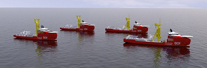 The new designs have been developed in close cooperation with DOF and Technip. The Norwegian built vessels will carry pipe lay towers rated at 650 tons, among the largest ever in the industry. At 340 tons, the Brazilian built vessels will be among the most complex vessels ever constructed in Brazil. Topside equipment for all four ships will be delivered by Huisman of the Netherlands.
