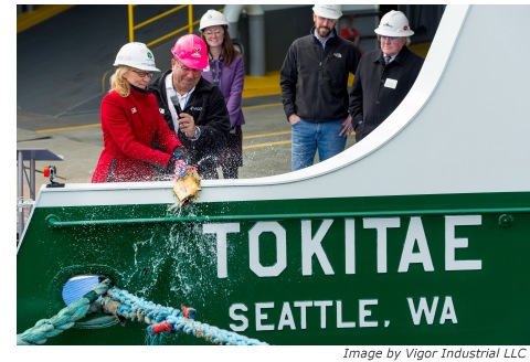 State elected, transportation and manufacturing leaders were on hand today to celebrate the christening of the state’s first 144-car Olympic Class ferry, the M/V Tokitae, at Vigor Industrial’s shipyard in Seattle.