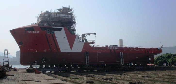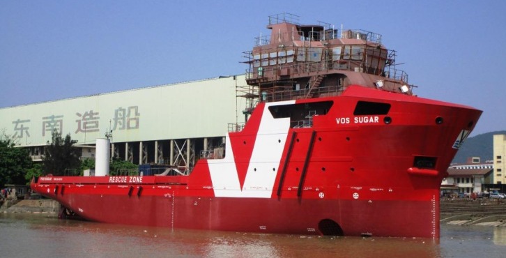 07 May 2015 We are pleased to announce the launching, on Sunday 3 May 2015, of VOS Sugar. VOS Sugar is a 68-metre subsea-support vessel (SSV), currently under construction at Fujian Southeast Shipbuilding in China. VOS Sugar is the first of two such newbuilding vessels being built in Fujian, both fitted with an active heave-compensated crane. They will be the sixth and seventh vessels in Vroon Offshore Services’ growing SSV fleet, with two additional SSVs planned for 2016. The VOS SSV portfolio is based on vessel designs developed by Vroon’s Performance and Engineering Department, reflecting both client specifications, market requirements and substantial in-house offshore experience. VOS Sugar will be delivered to the company in September. After her arrival in Europe, she will be further outfitted during the winter months and will be ready in good time for the 2016 subsea season. She will be operated by Vroon Offshore Services Den Helder.