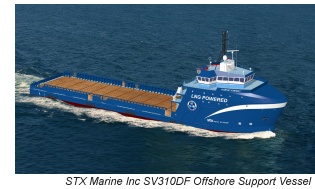 Wärtsilä will deliver an integrated system that includes the dual-fuel machinery, electrical and automation package, complete propulsion, and also the LNG fuel storage and handling components. The STX Marine Inc SV310DF Offshore Support Vessels will be powered by Wärtsilä 6-cylinder 34DF dual-fuel engines. The LNG storage capacity of 290 cubic meters (m3), enables more than a week of vessel operational time. In addition, the vessels will carry 5520 tons of deadweight at load line and have a transit speed of 13 knots. The vessels are scheduled for delivery in two years and will operate in the Gulf of Mexico.