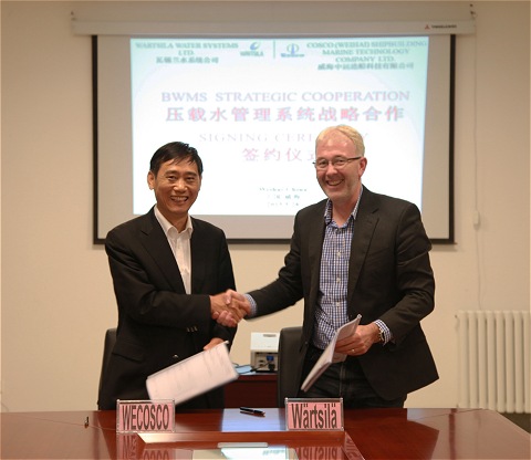 1 June 2015 Wärtsilä has signed a manufacturing license agreement with COSCO (Weihai) Shipbuilding Marine Technology Company Limited (WECOSCO) based in Weihai, China. The two-way agreement provides COSCO with access to technology and the rights to manufacture the Wärtsilä Aquarius Electro Chlorination (EC) Ballast Water Management System (BWMS) under license for application in their global marine market. In return, Wärtsilä gains access to an additional manufacturing facility able to assist with supply and demand of the Wärtsilä BWMS direct to Wärtsilä customers. The agreement was signed in Weihai on 28th May 2015 and takes effect from 1st June 2015. Wärtsilä retains ownership of the Aquarius EC technology and all associated Intellectual Property Rights, and will provide technical support to WECOSCO who will manufacture the system under license for applications on ships across the global marine market including COSCO. COSCO operates a number of shipyards in China and has one of the largest shipping fleets in the world. The Aquarius EC BWMS will be supplied with Type Approvals obtained by Wärtsilä and according to both IMO and USCG legislation will be installed not only new ships but also for the significant retrofit market. “This is a landmark agreement forming an important new partnership, which facilitates the supply of Wärtsilä Aquarius EC BWMS to a significant part of the Chinese marine market, both for new build ships and retrofit projects. By combining the strengths of our two companies, we can more effectively meet the growing demand for EC based BWMS in the short term and for medium to large vessel applications. Our combined global service networks also ensures that the BWMS are fully supported wherever and whenever needed,” says Dr Joe Thomas, Director, Ballast Water Management Systems, Wärtsilä Ship Power. “As one of the Fortune 500 companies, COSCO is engaged in shipping, logistics, shipbuilding and ship repairing. Wärtsilä is a world famous supplier for marine equipment. By combining the strengths and giving full play to the advantages of both companies, we have achieved a win-win cooperation. The agreement, which has a representative meaning for both of us, is a good foundation for our further cooperation,” says Mr Jia Lianjun, Chairman of WECOSCO board of directors. The agreement has a 5 year initial term. The two companies will support each other in delivering the BWMS technology to a broader customer base, and in providing long term global service support and sales of spare parts for our combined customer base The Wärtsilä Aquarius EC Ballast Water Management System The Wärtsilä Aquarius EC BWMS provides robust technology for the treatment of ballast water using a simple two stage process involving filtration and electro-chlorination (EC). It is effective in all operating and environmental conditions. The system is easy to integrate and maintain, and is type approved according to the IMO Convention and has an Alternative Management System (AMS) acceptance certificate from the United States Coastguard (USCG). The Aquarius EC BWMS has also successfully completed landed based testing in accordance with the USCG environmental technology verification (ETV) protocols and USCG Type Approval is anticipated early in 2016. Wärtsilä in brief: Wärtsilä is a global leader in complete lifecycle power solutions for the marine and energy markets. By emphasising technological innovation and total efficiency, Wärtsilä maximizes the environmental and economic performance of the vessels and power plants of its customers. In 2014, Wärtsilä's net sales totalled EUR 4.8 billion with approximately 17,700 employees. The company has operations in more than 200 locations in nearly 70 countries around the world. Wärtsilä is listed on the NASDAQ OMX Helsinki, Finland. www.wartsila.com Wärtsilä Corporation press release |