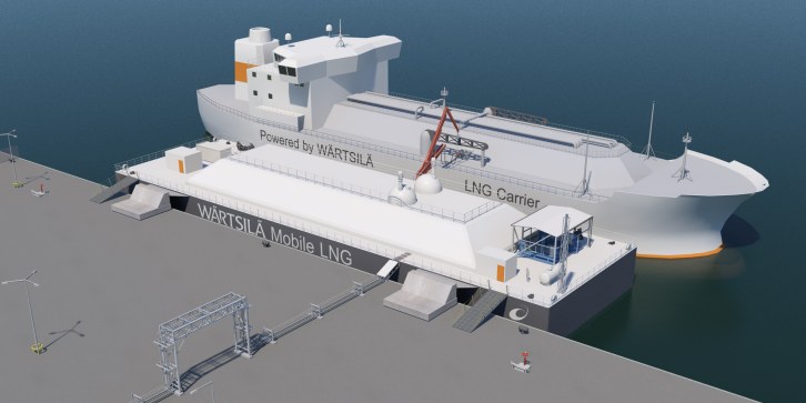 27 October 2015 A new LNG (liquefied natural gas) storage and regasification barge concept is introduced by Wärtsilä. This innovative solution provides a flexible means of meeting small to medium scale requirements where pure land-based LNG options are limited. Wärtsilä’s Marine Solutions and Energy Solutions businesses have combined their expertise in developing the concept. This latest Wärtsilä innovation will be presented at the Gastech conference and exhibition being held October 27 – 30 in Singapore. The Wärtsilä Mobile LNG can easily be combined with a barge-mounted power plant having an output capacity of up to 250 MW. Alternatively, it can be used to supply conventional land-based power plants. The Wärtsilä Mobile LNG solution will make LNG available to new consumer segments, and will benefit both utilities and end-users. Most especially, the flexibility of location can bring clean energy to areas that have only limited or no access to the national electricity grid. “Wärtsilä’s solutions support the entire gas value chain, from drilling and production, to delivery, liquefaction, regasification, storage, and power generation. This latest innovation is one more important step towards completing our LNG infrastructure offering. Most existing facilities are geared for larger-scale users, whereas the Wärtsilä Mobile LNG offers a flexible and mobile option for small to medium requirements,” says Timo Koponen, Vice President, Flow and Gas Solutions, Wärtsilä Marine Solutions. The Wärtsilä Mobile LNG has been developed for challenging locations where pipelines and large-scale LNG receiving terminals are not feasible, or where the quantities of LNG needed are smaller. It represents an ideal solution for shallow water areas where access for larger vessels would not be possible without major jetty constructions or dredging operations. Compared to constructing conventional land-based terminals in difficult soil conditions and areas with an undeveloped infrastructure, the barge can represent a significantly lower capital investment (capex) and faster delivery. Furthermore, being mobile, it can be easily re-located giving it a high resale value. Link to more information on wartsila.com: Wärtsilä mobile LNG