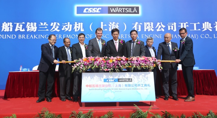 ground breaking for new factory 29 October 2015 CSSC Wärtsilä Engine (Shanghai) Co. Ltd (CWEC) celebrated the commencement of its new factory construction with a ground breaking ceremony on October 28. The new 20,000 sq.m. facility is located at Lingang, Shanghai. Following the ground breaking ceremony, strategic cooperation agreements were signed between CWEC and the Hudong Zhonghua and Shanghai Waigaoqia (SWS) shipyards. These agreements will be instrumental in promoting the development of efficient ship designs and solutions that will meet the evolving needs of the yards’ ship owner customers. A Letter of Intent was also signed with SWS for the delivery in 2017 of Wärtsilä Auxpac 32 generating sets for three large container vessels being built at the yard. The CWEC joint venture was established in July 2014 for the manufacture of medium and large bore, medium speed, diesel and dual-fuel Wärtsilä engines. The new factory will be the first in China capable of producing locally large bore medium speed diesel and dual-fuel engines. By being able to produce and deliver locally, the new joint venture will provide CSSC Group and other Chinese yards with closer access to the Wärtsilä range of engines with the benefits of faster delivery times and competitive pricing. The products to be manufactured at the new facility will include the Wärtsilä 26, Wärtsilä 32, Wärtsilä 34DF, and Wärtsilä 46F engines, the first of which are expected to be ready for delivery in 2016. The production capacity is planned at 180 engines per year. “It is an honour and a privilege to celebrate this latest milestone in our joint venture journey. By combining the strengths of our two companies; CSSC’s strong capabilities as the number one ship builder in China and Wärtsilä’s industry leading technologies, we can together make an important difference in today’s challenging global marine market,” says Roger Holm, Senior Vice President, Engines, Wärtsilä Marine Solutions. “This is an important occasion for the shipping industry in China. The new factory will produce state-of-the-art marine engines that will serve our customers with value adding efficiencies. We are pleased to cooperate with Wärtsilä in this exciting joint venture,” says Wu Qiang, President of CSSC. The CWEC joint venture will target especially the offshore and LNG markets, both of which are growing significantly in China, as well as the large container vessel segment. Wärtsilä’s share of the joint venture is 49 percent.