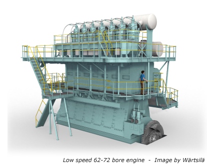 “At launch, the new engines are IMO Tier II compatible and available with IMO Tier III solutions. The design philosophy and main engine parameters have been selected to give high levels of reliability as the first priority. At the same time, the design enables the lowest possible manufacturing costs,” says Lars Anderson, Vice President, Merchant, Wärtsilä Ship Power. Since the engine design parameters also allow for a compact engine room, shipyards can now use the same engine room module for various vessel types, from bulk carriers and tankers to container vessels. Furthermore, owners can rationalise their crew training and spares for the entire fleet. Significant benefits for ship owners, operators, and shipyards The new engines offer significant benefits to both shipowners and operators. The stroke/bore ratio offers good internal efficiency with a gain of 1-2 percent compared to current engines, and depending on the vessel type, the lower engine speeds make it possible to improve propulsion efficiency by 2-6 percent. The layout fields of both engines are extended to maintain output, while allowing an increased shaft speed. The extended fields offer added flexibility to select the most efficient propeller speed for the lowest daily fuel consumption, and the most economic propulsion equipment, for a wide varity of vessel types. This concept was first applied successfully with the Wärtsilä RTA/RT-flex 82 bore engines. The new engine designs also offer de-rating possibilities, which can further improve either the engine’s internal efficiency or its propulsion efficiency, or both. Overall efficiency gains of 5-8 percent at vessel level can therefore be expected. As this directly reduces the emission levels of carbon dioxide (CO2), sulphur oxides (SOx), and nitrogen oxides (NOx), it will be easier for shipyards to satisfy EEDI (Energy Efficiency Design Index) requirements. Wärtsilä’s leading common-rail technology Wärtsilä is the market leader in common-rail technology for electronically-controlled low-speed marine engines. These engines incorporate the latest electronically-controlled common-rail technology for fuel injection, valve actuation, engine starting, and cylinder lubrication with direct benefits to shipowners. Wärtsilä’s common-rail technology provides a high degree of flexibility in engine settings to give lower fuel consumption, very low minimum running speeds, smokeless operation at all running speeds, and outstanding control of exhaust emissions. The integrated redundancy of the engines ensures high reliability. Furthermore, the excellent regulation of engine operation provided by the Wärtsilä electronically controlled engine system, allows for good manoeuvring capabilities and the lowest possible operating speed, for example, during canal passages and port entrance. Wärtsilä’s common-rail technology plays a key role in enabling shipowners to meet the challenges of higher fuel costs. Wärtsilä in brief Wärtsilä is a global leader in complete lifecycle power solutions for the marine and energy markets. By emphasising technological innovation and total efficiency, Wärtsilä maximises the environmental and economic performance of the vessels and power plants of its customers. In 2010, Wärtsilä’s net sales totalled EUR 4.6 billion with more than 17,500 employees. The company has operations in 160 locations in 70 countries around the world. Wärtsilä is listed on the NASDAQ OMX Helsinki, Finland. Wärtsilä Corporation, press release |