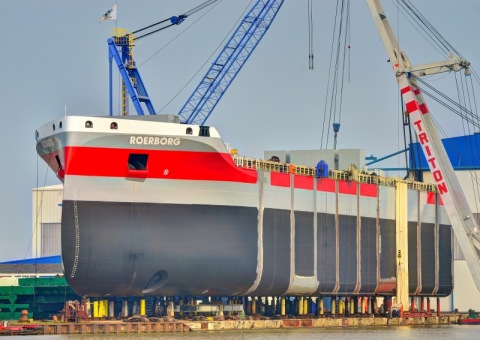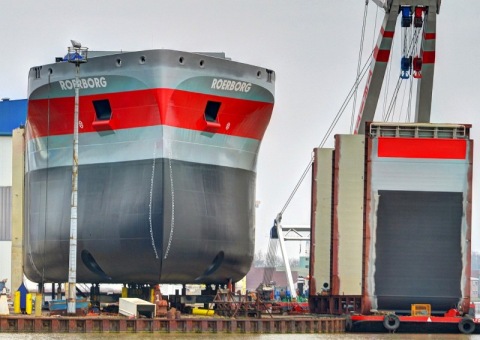 These vessels are designed with fully open hatch box, two holds, each with a length of 60 meters. The vessels are equipped with the possibility to partly place a removable pontoon tween deck. These panels can also be used as separation bulkheads on various positions. By the use of a propeller in nozzle configuration and a special designed hull shape, the main engine power could be reduced to 4.500 kw while the vessels’ speed is marginal influenced by draught or sea state. The vessels have an ice class 1a notation and are equipped and employable for world-wide trading including navigation on the Saint Lawrence Seaways, Panama Canal and Suez Canal. All this makes the vessels suitable for carrying general cargoes, such as steel, forest products, break bulk and bulk cargoes including grain. General specifications Length over all 169,75 meters Breadth over all 20,40 meters Depth (moulded) 13,75 meters Deadweight 23.249 tonnes Engine MAK 9M32 Speed 14 knots With these dimensions the vessel is nearing the maximum dimensional limits that can be built at the Leer production site. The m.v. Roerborg is planned for delivery September 2014. Royal Wagenborg press release |