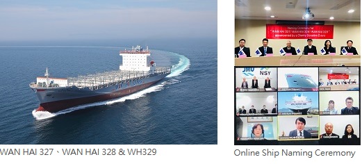 Taipei - Mar. 24, 2021 Wan Hai Lines Ltd. held ship naming ceremonies for WAN HAI 327, WAN HAI 328 and WAN HAI 329 accompanied by a charity donation today (24. Mar.). Due to the COVID-19 pandemic, a physical ceremony was replaced by an online one. WAN HAI 327, WAN HAI 328 and WAN HAI 329 are the last three vessels in a series of 3,055 teu containerships built by Japan Marine United Corporation Kure Shipyard. Ms. Keiga Lan, vice president of Yamahatsu Nihon Co., Ltd and Mrs. Tanzawa, wife of the general manager of logistic planning division, CANON Inc., and Mrs. Shiratori, wife of the manager of trading operations improvement office, Nitori Co., Ltd, named these three vessels respectively during the ceremony. The 3,055 teu series is based on an extra-wide beam design presenting an Loa of 203.5 m for a 34.8 m breadth, making them one of the most compact 3,000 teu-class vessels. They are designed with a deadweight capacity of 37,160 mt on 11.5 m draft and a maximum cruising speed of 21.60 nautical miles. The design of 3,055 teu series takes energy efficiency and environmentally-friendly aspect into account. Moreover, all the ships delivered are certified with “Smart Ship” notations by well-known classification societies. The newbuildings are part of Wan Hai Lines efforts to ensure their continuous pursuit of fleet upgrade in order to provide most quality service to customers. WAN HAI 327 will be delivered on March 26th at JMU Kure shipyard. After delivery, she will join Wan Hai Lines’ China-India service to provide efficient delivery service between China, Malaysia and India. In addition to naming the newbuildings, Wan Hai Lines also made charity donations to Mamena, Kure City social welfare council and Seishounen Fukushi Center, three local welfare organizations focusing on care for socially disadvantaged elders, children and youth. The charity donations represent part of Wan Hai Lines motto, “We carry, we care.”, as the company is committed to fulfill its corporate social responsibility, providing quality service to customers and bringing love to the society.