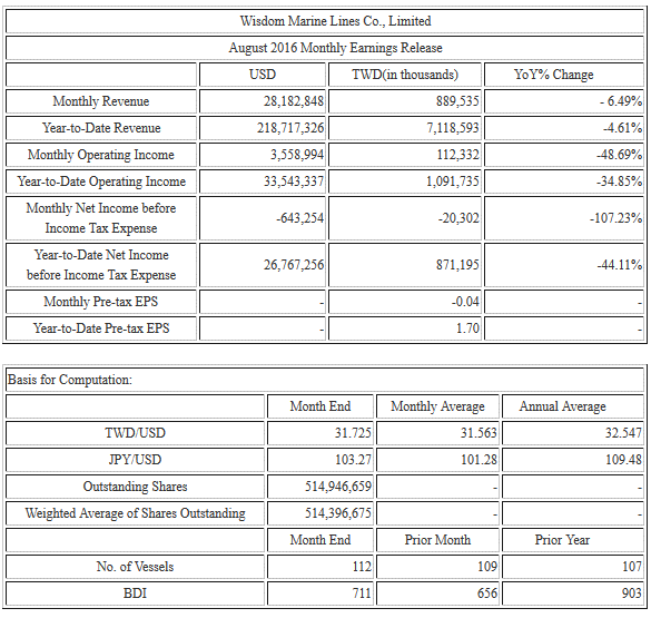 4. Renewal of Contracts: 3 vessels. 5. Operating Income:Operating income reduced due to charterers’ early termination of time charter contract this year. The Company recognized the compensation for early termination as other income and the difference between last contract and current contract caused the reduction of operating income. As a result, other income increased and operating income decreased. 6.Non-operating income: Net Income before Tax decreased comparing with monthly result last year because of the weak shipping market and the appreciation of Japanese Yen which led to foreign exchange loss. However, foreign exchange loss is an unrealized item which does not affect the Company’s cash flow. The Company evaluates foreign exchange gain/loss by the exchange rate at the end of each month, and the loss will be reversed if Yen depreciates afterwards. Besides, there was about US$600,000 loss on the valuation of the put option of the Company’s ECB categorized in other losses. The loss is an unrealized item which does not affect the Company’s cash flow. The Company evaluates ECB by the company’s share price at the end of each month. When the share price rises comparing to the last valuation, the loss will be reversed and gain will be recognized. Notes on Compilation: 1. We adopt IFRS. 2. Our functional currency is US Dollar. The representation of TWD figures are calculated based on the average exchange rate of the relevant period. Evaluation gain or loss is calculated based on the month end exchange rate. 3. Rate of change is calculated with USD figures. 4. Earning per share is calculated based on weighted average of outstanding shares. 5. Depreciation and crew wage costs are calculated on a monthly basis, but revenue is calculated on incurred basis by day. Hence the calendar days of each month could slightly affect revenue and operating profits. 6. The lubricant oil expenses is estimated monthly and adjusted according to inventory check on a quarterly frequency. 7. The duration of each vessel might differ according to size, condition and specifications. Modern new buildings now are normally depreciated on a 25 year duration. 8. The earning release is based on unaudited provisional account. Monthly Net Income before Income Tax Expense reported in the earnings release includes earnings attributable to minority interests. Wisdom Marine Group press release |