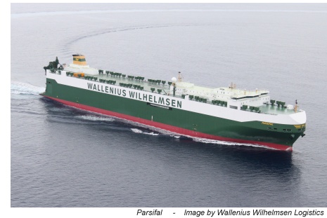 With a width of 12 metres and safe working load of 505 tonnes, the vessel’s stern ramp offers customers the possibility to ship larger units than ever before. The clear height of the main deck, 7.1 metres, is also unprecedented for this kind of vessel. Cargo can even be loaded on the weather deck, which has a ramp from the deck below. Three decks can be hoisted by electric winches to provide maximum flexibility and utilisation. MV Parsifal will commence service in the Wallenius Wilhelmsen Logistics’ round-the-world trade. ...and for sustainability Parsifal is our most fuel efficient vessel to date, thanks to optimised hull form and a number of energy saving features such as the streamlined rudder design and duck tail. In the engine room an advanced turbo generator produces electricity from the waste, exhaust heat. In total, these initiatives help to reduce emissions per cargo unit by 10 to 15 percent. A PureBallast ballast water treatment system is installed with a capacity of 1000 m3/hour fulfilling IMO´s “Convention on Ballast Water Treatment”. “Such investments are how we maintain our promise to deliver innovative and sustainable global shipping and logistics solutions to our customers," says Arild Iversen. Wallenius Wilhelmsen Logistics press release |