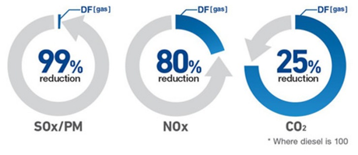 Image by Yanmar Co., Ltd. A dual fuel engine that significantly cleared exhaust gas regulations From January 2020, environmental regulations on ship fuels became stricter, with regulations on the sulfur content of ship fuels tightening, in all sea areas around the world. Yanmar focused on LNG, which has excellent environmental performance, and has been used in existing diesel engines since 2012 as a dual fuel engine (dual fuel engine) that can operate in both a gas mode with LNG fuel and a diesel mode with diesel fuel. Research and development commenced, based on the 6EY26 engine, and proceeded to commercialization by April 2016. A dual fuel engine that uses two types of fuel, LNG and diesel, requires advanced control technology. High-precision air flow control technology was introduced into the 6EY26DF, and by maintaining the engine in the optimum combustion state at all times, high reliability was achieved, and stable operation made possible. In the gas mode, NOx is reduced by about 80%, SOx, PM is reduced by about 99%, and CO2 is reduced by about 25% when compared with the exhaust of Yanmar's IMO secondary regulation compliant diesel engine. the gas mode also clears the IMO tertiary regulation for NOx reduction.