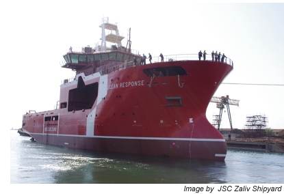 Shipyard Zaliv has completed the construction of the vessel intended for drilling platforms service (field support vessel) (total launching weight is approximately 1550 tons, deadweight is 2400 tons).
