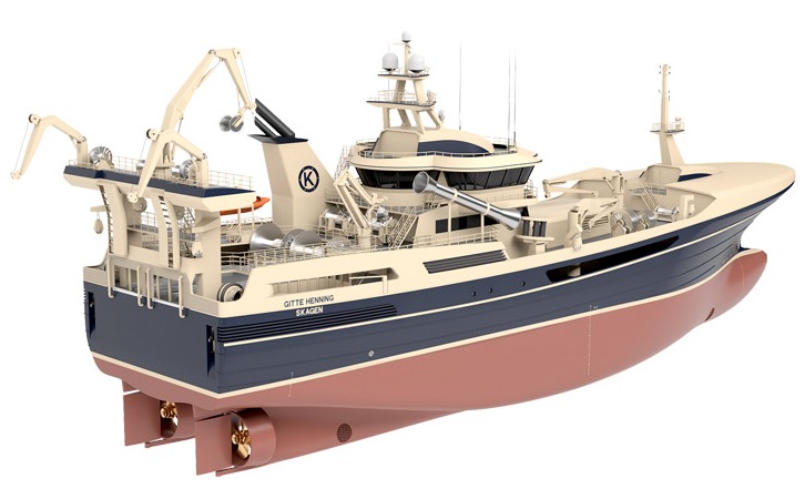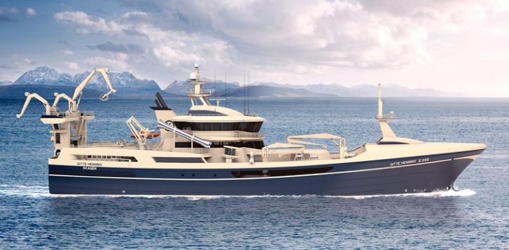 Nov 28, 2019 GITTE HENNING fishing company is leading the way by bringing fishing in blue Denmark into a new, green age by contracting a new, environmentally friendly pelagic fishing vessel from the Spanish shipyard Zamakona in Bilbao. Henning Kjeldsen says he initially intended to withdraw from fishing after the sale of Gitte Henning to the Faroe Islands, as well as receiving offers for all his pelagic fishing rights. After thinking about the future, I got cold feet doing nothing, and contacted Salt Ship Design, says Henning. Together, Henning and Salt have now designed a new, green Gitte Henning. The new fishing vessel will have a number of environmentally friendly solutions, many of them new in pelagic fishing. Throughout the design process and in the choice of equipment, the focus has been on improving quality of the fish and reducing emissions through reduced energy consumption and efficient power production. By ordering a new Gitte Henning it is the fourth time Henning Kjeldsen and the Sandvik family are designing a vessel together, and the second time Henning is ordering a Salt-design. REDUCED ENERGY CONSUMPTION Propulsion and manoeuvring The one large propeller that is common on pelagic trawlers has been replaced by two propellers and a twin-skeg hull design. Extensive flow analysis and model tests result is a more efficient stern and propeller design, which provides larger trawling pull and less fuel consumption during trawling. Large rudder angles are often needed on conventional fishing vessels to maintain course, even in moderate weather conditions. Two propellers provide the opportunity to steer the ship with minimal rudder impact, which reduces additional energy requirements during sailing and trawling. Permanent Magnet Motor (PM) The two propellers are powered by two electric Permanent Magnet (PM) motors. This type of motor has less electrical loss and can operate significantly more efficient than conventional electric motors throughout the power range – particularly at low engine speeds. Low propeller rpm has the following advantages: • Better propeller efficiency at typical loading • No need for reduction gear and thus no mechanical loss • Reduced noise Electrical winches All winches are also powered by PM motors for reduced loss and optimal operation. Electrical winches provide the opportunity to regenerate, the other vice lost, energy when the trawl is set. This energy is available to other consumers and can, for example, be used for propulsion or RSW (refrigerated sea water) cooling. Conventional hydraulic winches and fishing pumps require a system with a significant amount of hydraulic oil. The risk of hydraulic oil spill to sea is eliminated by choosing electric winches. RSW cooling and fish quality The RSW area at the new Gitte Henning is arranged in a new way that gives inner surfaces of the RSW tanks a smooth finish with no obstructions or sharp edges. The vessel is equipped with four independent cooling systems, with four RSW tanks per facility. This provides a more efficient cooling process by only cooling parts of the fish tank volume at the time, resulting in an optimal, energy saving cooling system. In addition, the capacity of the vacuum system for unloading has been increased by 40% compared to normal unloading capacity. Overall, this will provide a more careful handling of the fish that will improve quality. Electrical operation All electric motors, from winches to pumps, are frequency controlled. This will provide a more customised power supply and hence reduce the overall energy consumption.