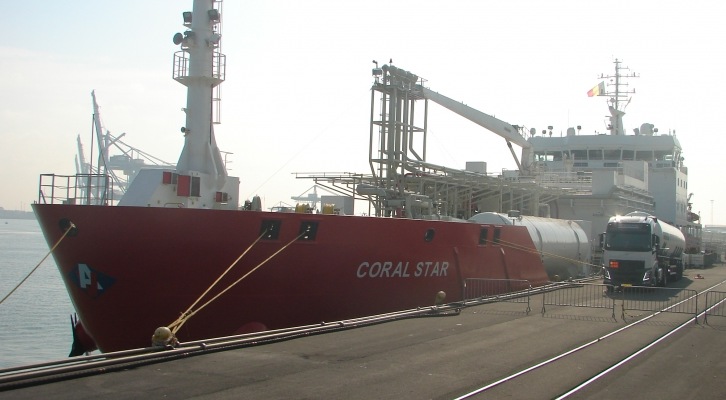 9 October 2014 For the past week, LNG trials were performed on Anthony Veder’s newly built gas carrier Coral Star. The ship is equipped with a dual fuel engine, which allows the vessel to run on heavy fuel oil (which is still the standard marine fuel) as well as the more environmentally friendly LNG (liquefied natural gas). Before Anthony Veder is able to deploy this latest asset to their fleet of gas carriers, the ship’s fuel supply systems and the dual fuel engine needed to be thoroughly tested, both for fuel and for LNG. The fuel tests were completed at the Chinese shipyard, but for the specific LNG tests, Anthony Veder decided that the ship should come to Zeebrugge, due to Zeebrugge’s strong reputation and expertise in LNG. The technical tests on the Coral Star were performed by Hoppe Maritime Group in Zeebrugge. The tanks were prepared on the terminal in order to receive LNG (cooling down and inerting). The LNG fuel tanks were partially filled with LNG from a truck alongside the quay ( Truck-to-Ship bunkering method). The engine’s power was tested with the aid of a ‘load bank’, an installation that adds artificial ballast, to see whether or not the engine was able to produce enough power to keep the ship moving, also at sea. The Coral Star completed all the tests successfully. Also the sister vessel Coral Sticho is on its way from China to Zeebrugge for the same assignment. The vessel is expected to arrive in Zeebrugge on 18 October. “We are very pleased to be able to work with the port of Zeebrugge and Hoppe Maritime Group on this special project. After all, the Coral Star and Anthony Veder’s other new vessels are in fact the world’s first ethylene tankers driven on LNG.” Ferdinand Dekker, Manager Operations Anthony Veder Chartering B.V. “These operations confirm the role of our terminal in these pioneering times for LNG bunkering. The availability of our installations, the available gas expertise and the generally appreciated flexibility cause gas shipping companies to choose Zeebrugge!”, General Manager Hoppe Maritime Group, Stefaan Hoppe. These LNG trials performed for Anthony Veder Chartering Company are yet another confirmation that Zeebrugge is in fact a front runner in the development of LNG as a maritime fuel. Earlier, Zeebrugge was chosen to perform LNG Truck-to-Ship bunkering operations for the world’s first two LNG driven tugboats. Also, Mitsubishi Corporation, GDF SUEZ and NYK LINE ordered the world’s first LNG bunkering vessel before the summer, which will operate from the port of Zeebrugge in 2016.
