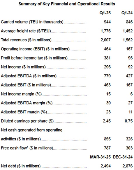 Financial and Operating Results for the First Quarter Ended March 31, 2025 Total revenues were $2.01 billion for the first quarter of 2025, compared to $1.56 billion for the first quarter of 2024, mainly driven by the increase in freight rates and carried volume.
