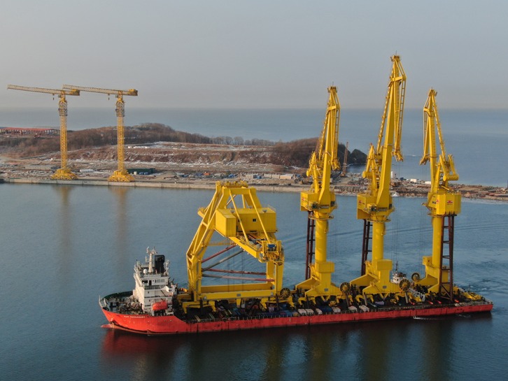 15 January 2021 Another large batch of crane equipment with a lifting capacity of 32 to 60 tons for the shipyard's hydraulic structures has been delivered to the Zvezda Shipbuilding Complex - three portal-mounting cranes and a Rail Mounted Gantry. After unloading of the equipment, its installation and commissioning will begin. The most powerful item was a Rail Mounted Gantry with a lifting capacity of 60 tons, equipped with magnetic traverse. It, as well as a portal gantry crane with a lifting capacity of 50 tons, will be placed on the cargo quay of the shipyard for acceptance of heavy cargo arriving by sea. The installation of another two from the newly arrived portal-mounting cranes with a lifting capacity of 50 and 32 tons will allow finishing the completion of crane equipment for the outfitting quay and shallow-water quay. The cranes are designed for execution of outfitting work on vessels and will carry out unloading of materials, which are necessary for the production activities of the shipyard. Zvezda, SSK has a unique fleet of crane equipment of various lifting capacity and assignation, including two Gantry cranes of the Goliath type with a lifting capacity of 1200 tons each, equipped with an automated intelligent control system.
